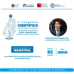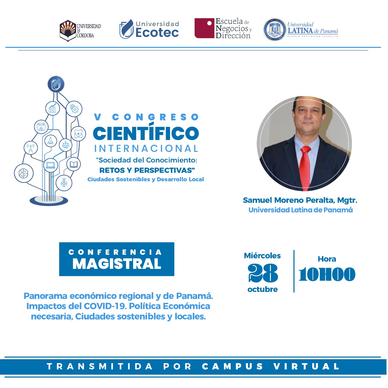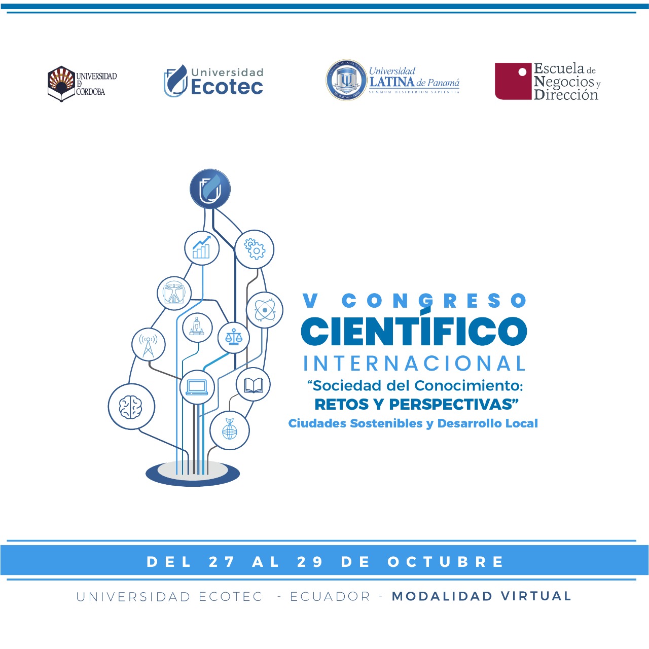 Del 27 al 29 de octubre, celebramos el V Congreso Científico Internacional “Sociedad del Conocimiento: Retos y Perspectivas” Ciudades Sostenibles y Desarrollo Local con el apoyo académico de la Escuela de Negocios y Dirección (ENyD), la Universidad de Córdoba (ambas de España) y Universidad Latina de Panamá.