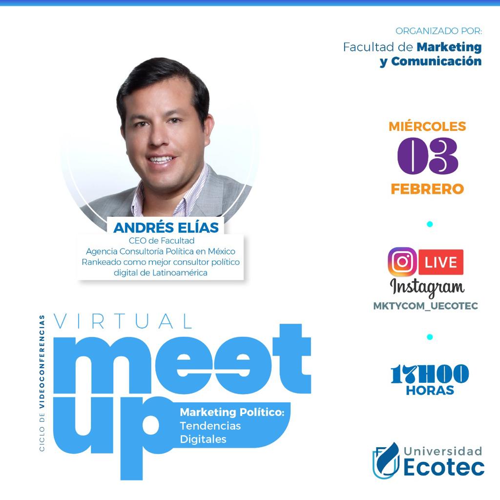 Andrés Elías, ALUMNI ECOTEC participó del primer Virtual Meet Up donde compartió su experiencia en el ámbito del Marketing Político con la comunidad universitaria a través de Instagram Live. Este evento lo organiza la Facultad de Marketing y Comunicación.